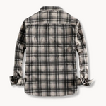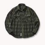 Cămașa din Flanelă de Corduroy cu Model Retro este o cămașă cu butoane în față, realizată dintr-un amestec de corduroy cu un finisaj periat. Țesătura oferă o senzație texturată și căldură constantă, în timp ce menține libertatea de mișcare. Croiala este relaxată, cu o ușoară subțiere la talie pentru a permite o siluetă curată fără a restricționa mișcările.