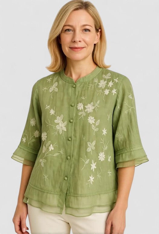 Kourtney este combinația perfectă între eleganță și confort. Broderiile subtile cu flori și materialul ușor conferă acestei bluze un aspect romantic, ideal pentru un look stilat și fără efort.