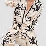 Setul de pijamale Emma combină perfect luxul și confortul. Fabricat din viscoză netedă ca mătasea, cu un finisaj strălucitor, oferă o senzație incredibil de moale pe piele. Imprimarea modernă neagră pe un fundal crem adaugă o notă contemporană acestui ansamblu elegant. Croiala relaxată și materialul fluid asigură libertate maximă de mișcare—perfect pentru a te relaxa acasă sau pentru a face o declarație stilată într-un resort.