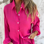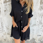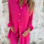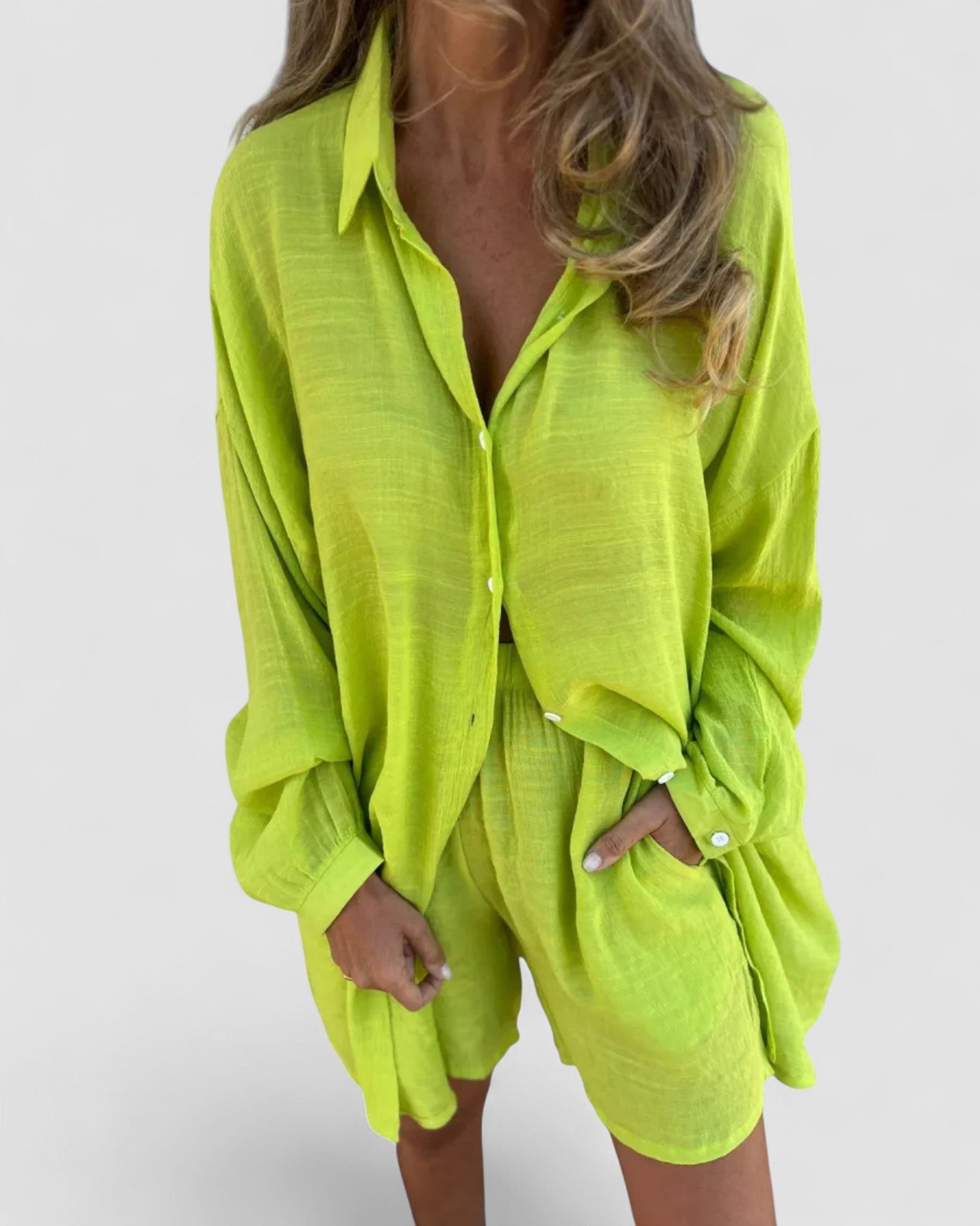 Setul constă dintr-o cămașă cu guler și mâneci lungi și un șort asortat cu talie înaltă, fiind ideal pentru orice ocazie: brunch, relaxare sau o plimbare pe plajă. Materialul ușor asigură un siluet fluid și aerisit pentru un confort optim și libertate totală de mișcare.