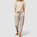 Descoperiți Setul Mia din in, un set de două piese, la modă și confortabil pentru femei. Perfect pentru vară, acest set combină un top lejer și pantaloni într-o nuanță elegantă de khaki.