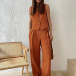 Design: Un set elegant format dintr-un top lejer și pantaloni cu talie înaltă, realizat dintr-un amestec de bumbac și in pentru o ținută confortabilă și respirabilă.