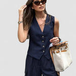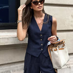 Design: Un set elegant din două piese, realizat respirabil, având un top scurt cu mânecă scurtă și detalii cu nasturi, împreună cu șorturi cu talie înaltă și buzunare funcționale. Silueta rafinată oferă un aspect curat și lustruit, cu ușurință în purtare zilnică.