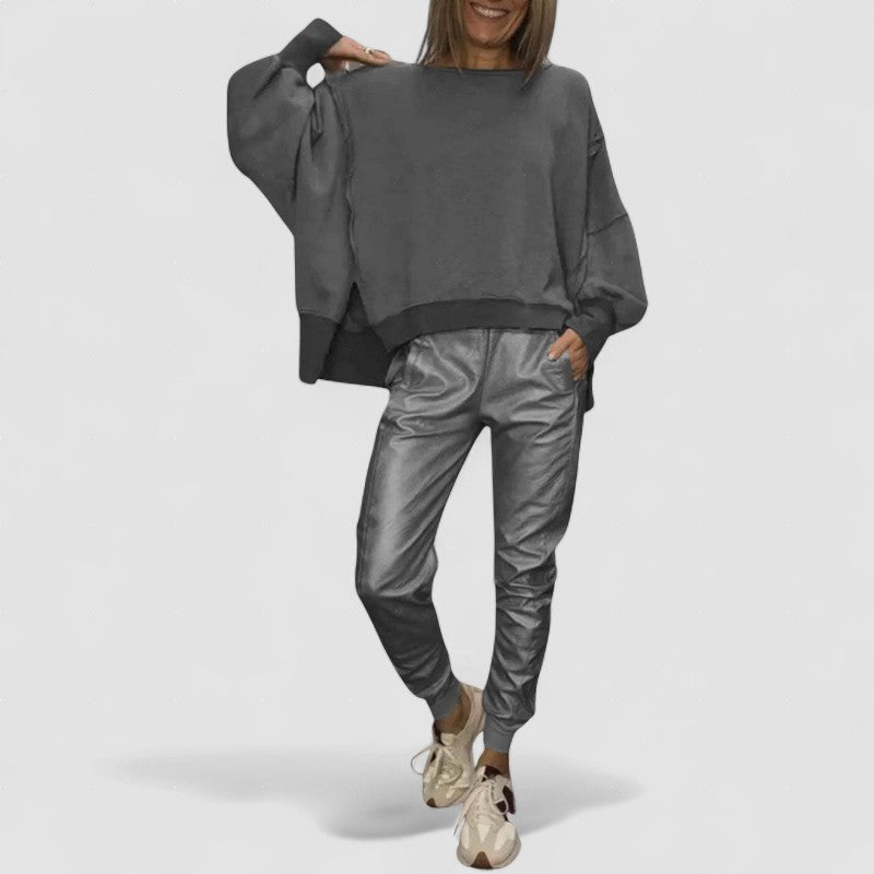 • Potrivire confortabilă: Pulover oversized și joggeri tapered pentru o eleganță relaxată