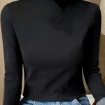 Realizat din materiale moi și elastice, acest top oferă o pasformă ajustată care se conturează frumos pe siluetă. Mâneci lungi și detalii unice, precum gulerul în formă de V, contribuie la un aspect modern și rafinat. Funcționalitatea sa este evidențiată prin confortul pe care îl oferă în activitățile de zi cu zi, fiind ușor de asortat cu blugi sau sub un sacou elegant.