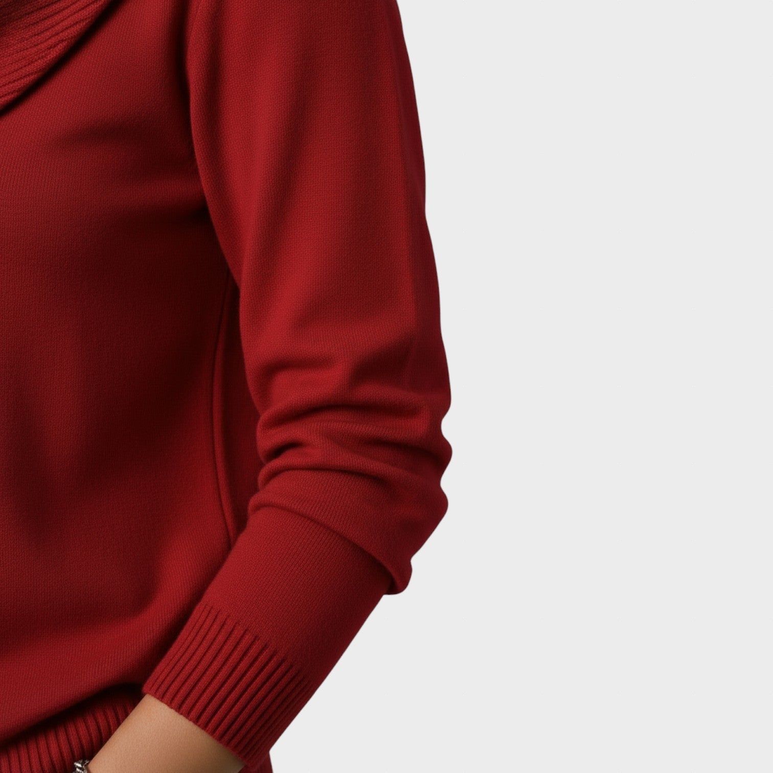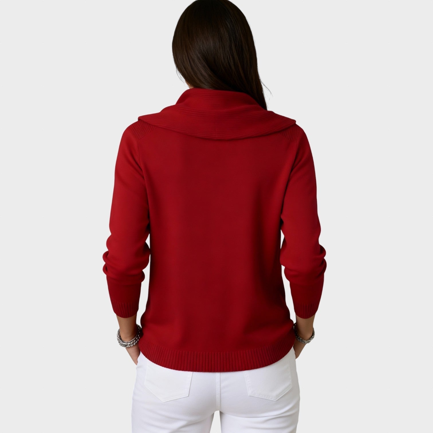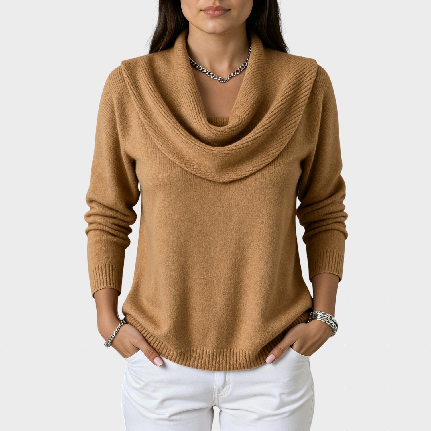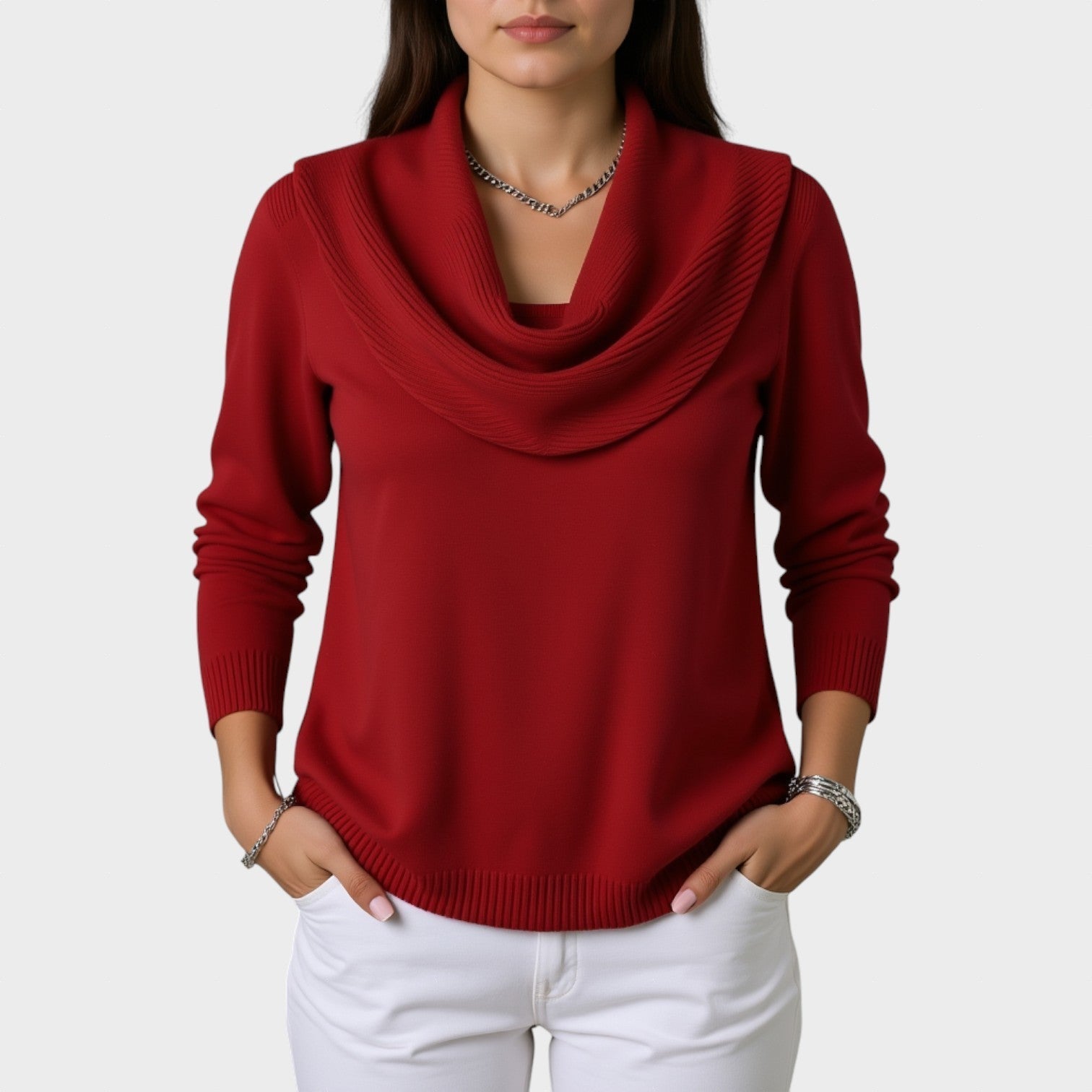 Un pulover elegant și confortabil, cu un guler drapat care adaugă o notă sofisticată și feminină ținutei tale. Țesătura moale se mulează frumos pe corp, oferind o cădere perfectă pentru orice ocazie — fie la birou, fie într-un look casual-chic.