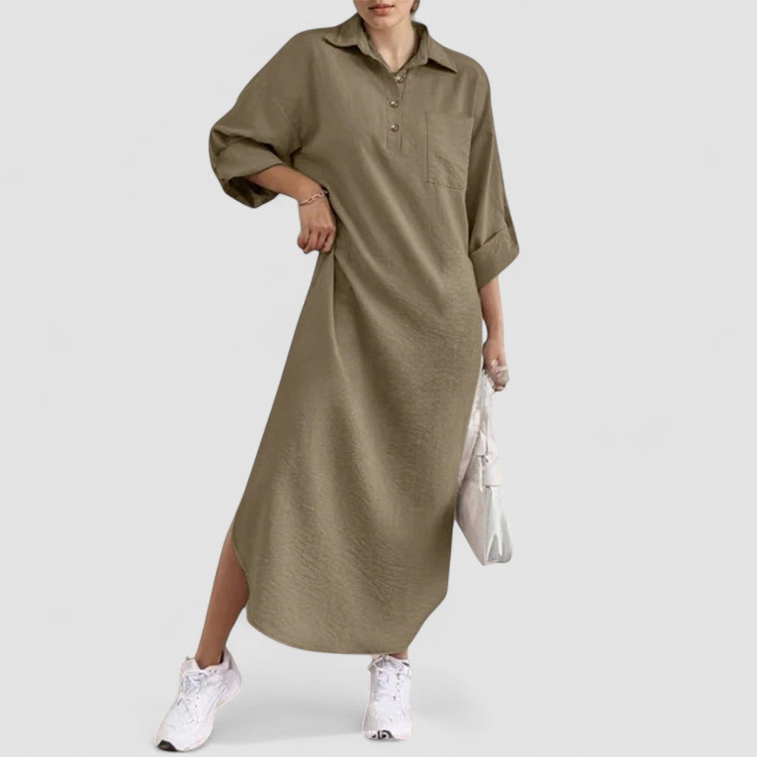Rochia Nova de la Lise & Rose København a fost creată pentru femeile care doresc un echilibru perfect între confortul lejer și stilul rafinat. Cu o siluetă elegantă și lungă, mâneci reglabile și un guler clasic, această rochie este ideală atât pentru birou, întâlniri sociale, cât și pentru zilele de relaxare.