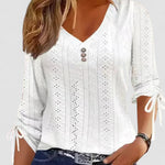 Bluza Maybelle combină eleganța atemporală cu un model jucăuș, cu decupaje și detalii subtile. Decolteul în V cu nasturi decorativi oferă un aspect sofisticat, în timp ce mânecile 3/4 cu fundițe adaugă un accent fermecător. Ideală atât pentru ținute de zi cu zi, cât și pentru ocazii elegante.
